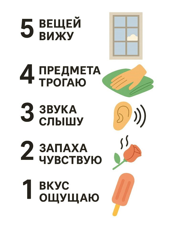 Одним из распространённых методов является техника "защитного заземления". Суть её проста: необходимо переключить внимание на окружающие нас предметы и ощущения.