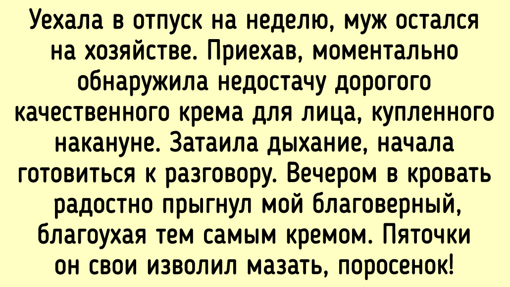 - После недели отпуска, вернувшись домой, женщина заметила исчезновение дорогого крема для лица. Увы, муж с радостью показал, как использовал его на своих пятках, вызывая гнев жены.