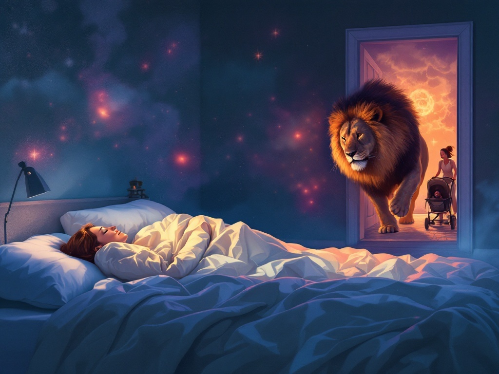 Во сне женщина вместе с ребенком оказывается на улице, когда внезапно появляется лев, готовый к нападению. Приняв решение, она отправляет ребенка в укрытие — в подвал, а сама стремительно забегает в подъезд, пытаясь скрыться от хищника. Но как только она закрывает дверь, застревает другая женщина с коляской, что приводит к неожиданному повороту событий. Этот момент становится решающим, и женщина просыпается в состоянии тревоги.