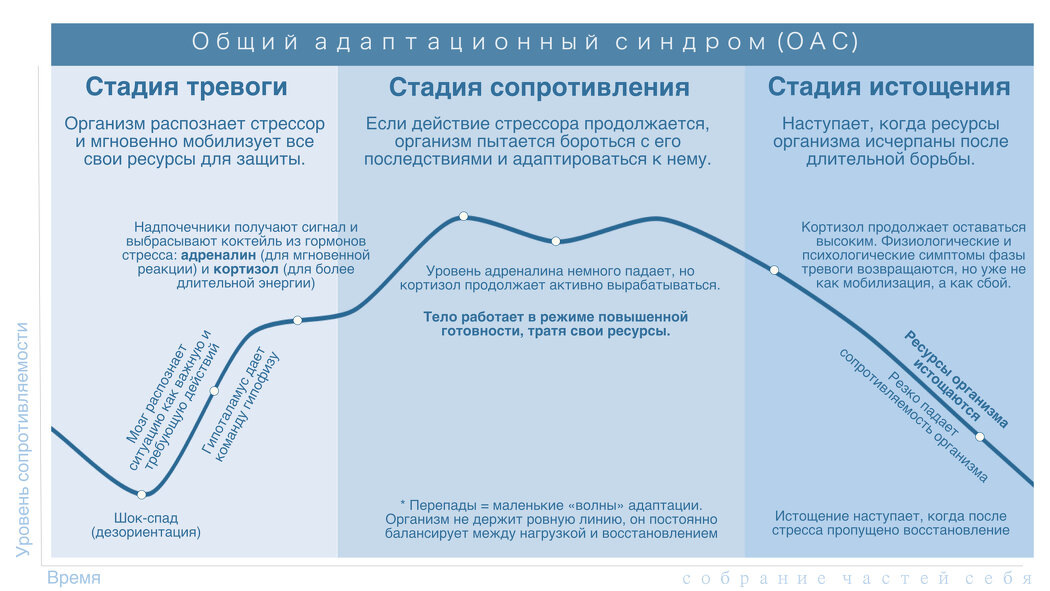 - Сопротивление и адаптация: Период, когда мы живем «на резерве», не осознавая, как расходуем свои ресурсы (появление раздражительности, недомоганий, нарушений сна).